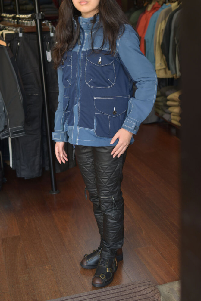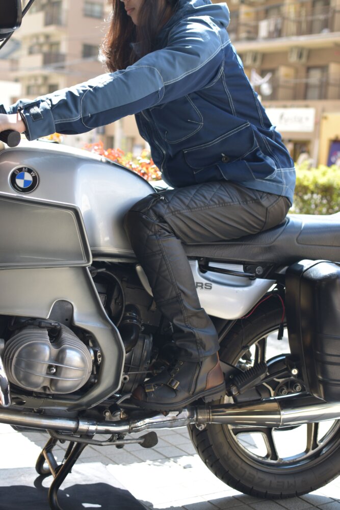 牛革(ウォッシャブル)のヒートガードを採用していますのでスキニースタイルのレディースでは膝から下がタイト目な仕上がりです