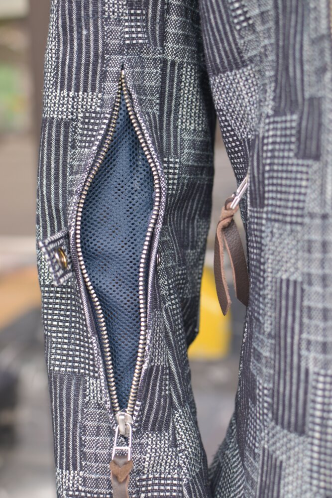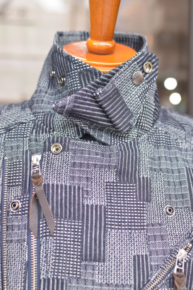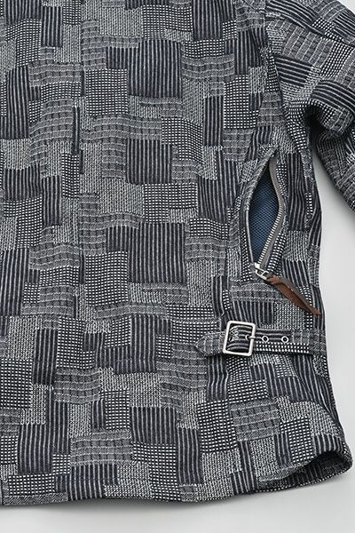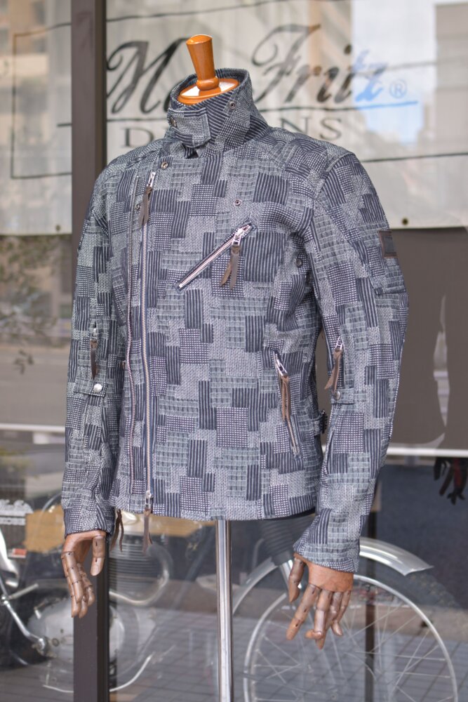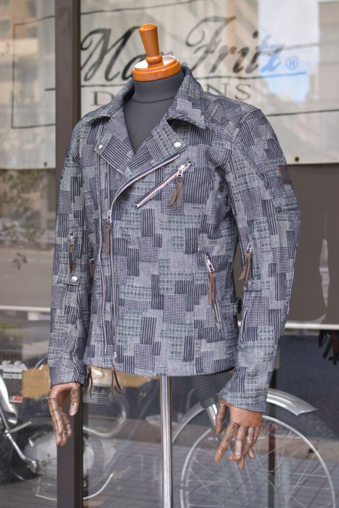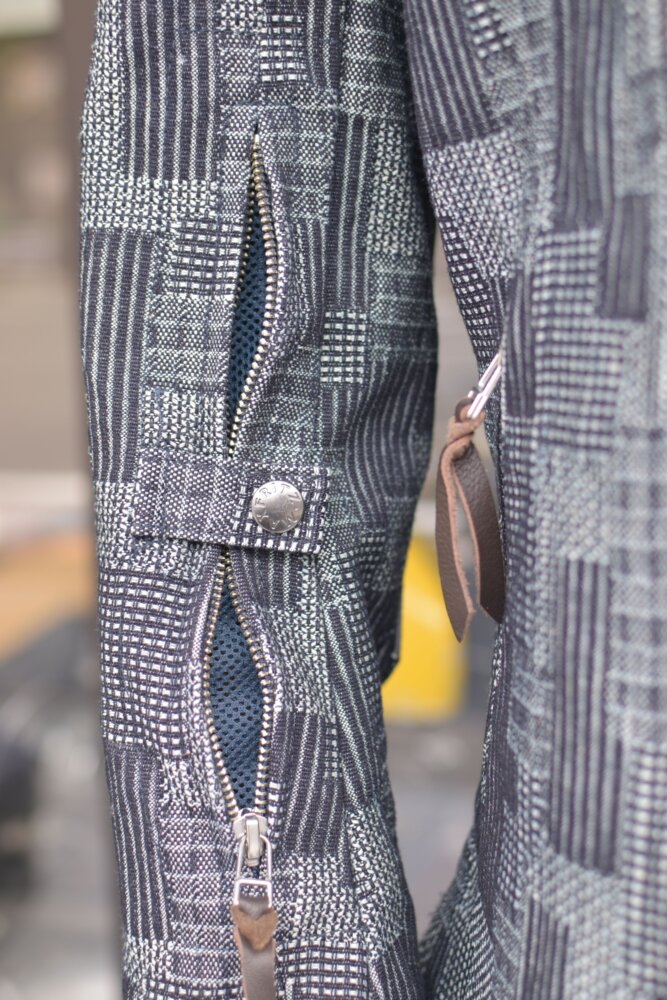 パッチワークを模した織りのデニムはしっかり感のある素材で春・秋のツーリング時に活躍する一着です。