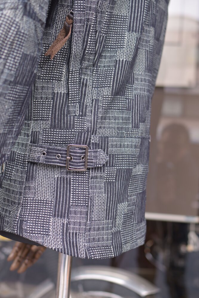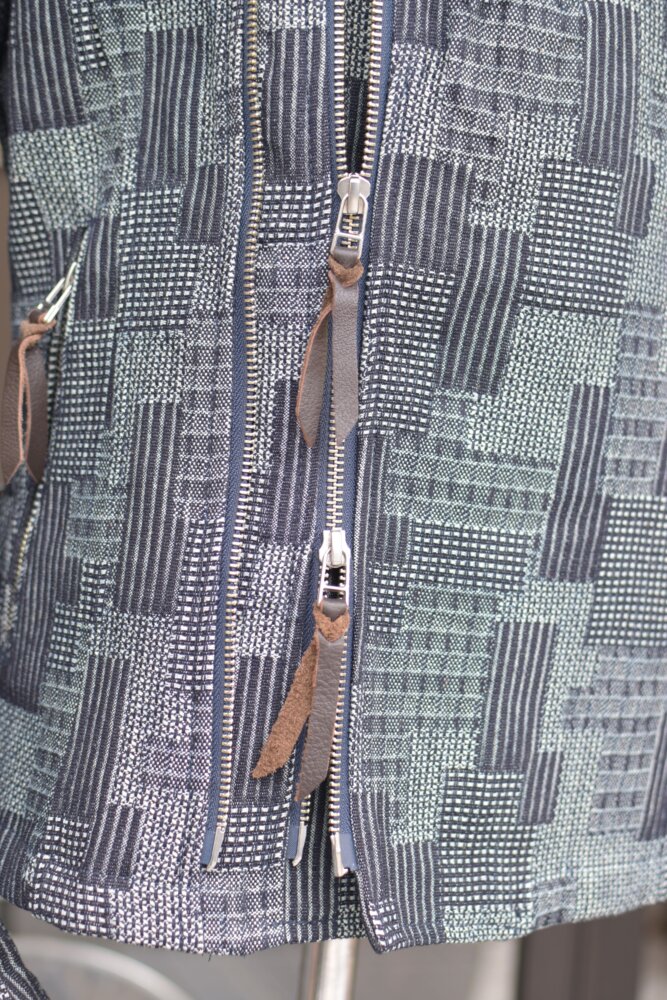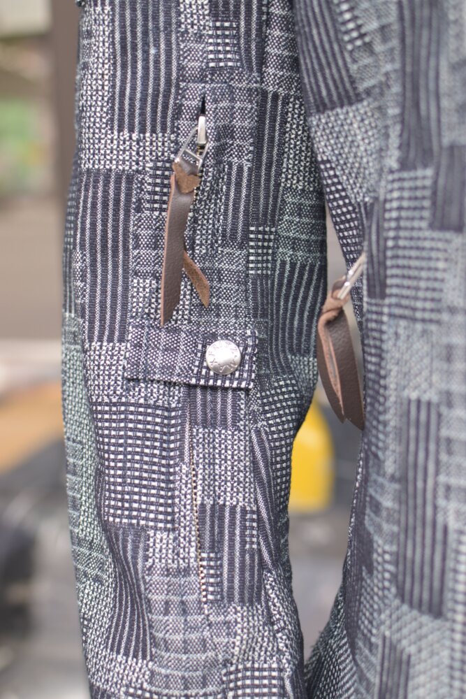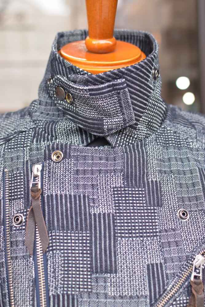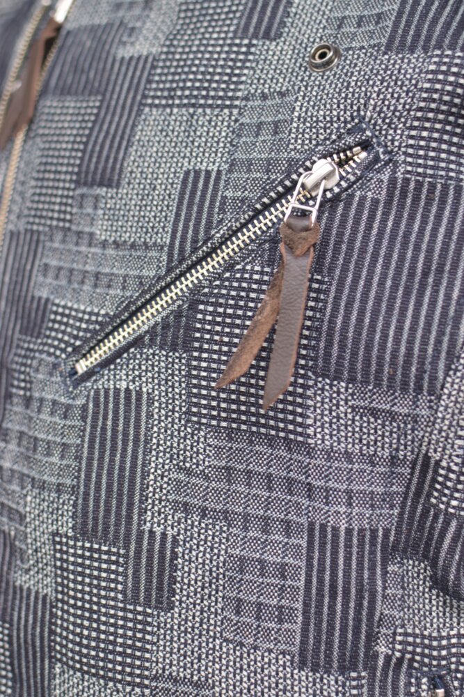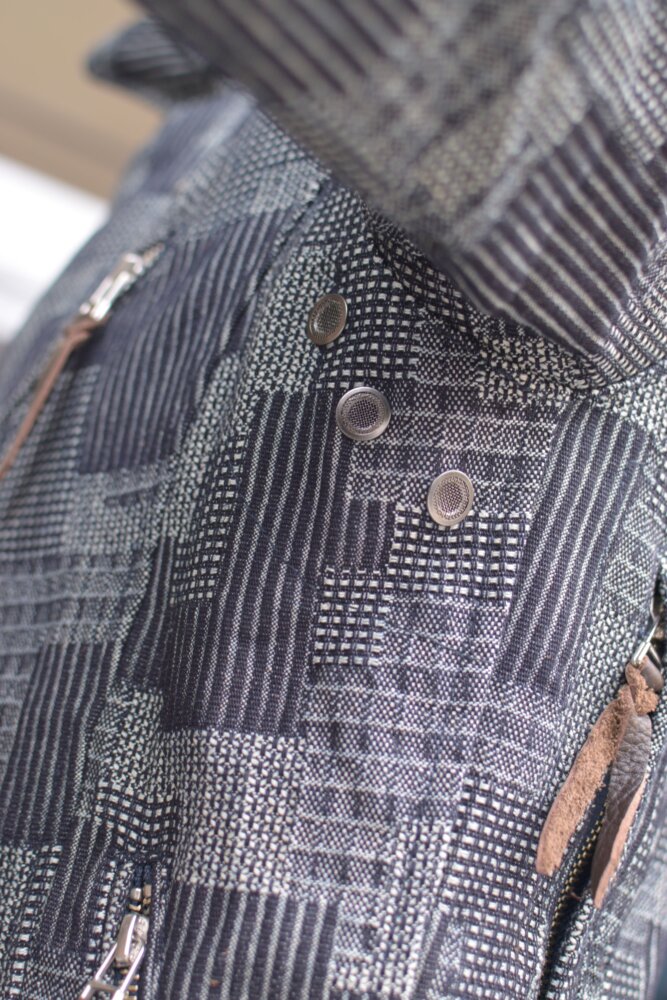 パッチワークを模した織りのデニムはしっかり感のある素材で春・秋のツーリング時に活躍する一着です。