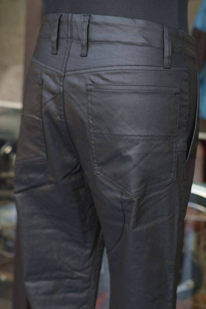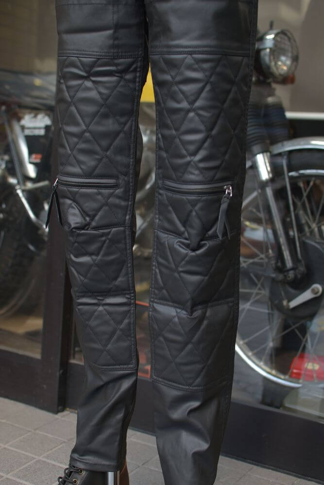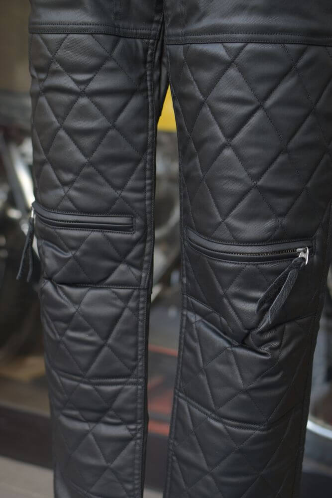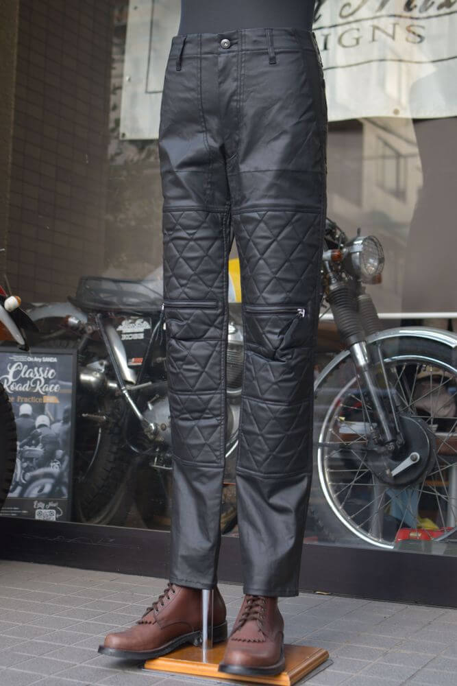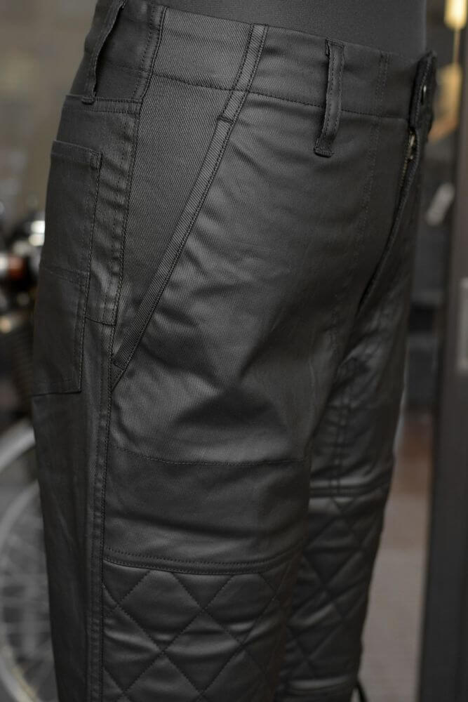 走行風を通しにくいレザーライクな質感でありながら汚れなど落としやすく家庭での洗濯も可能で手入れが楽なライディングパンツです